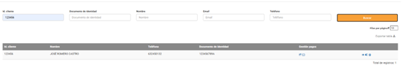 - Datos del cliente: No debes rellenar todos los datos de tu cliente, sino que esta sección actúa de buscador en tu cartera de clientes. Simplemente rellena algún dato identificativo y pulsa el botón buscar, para que se muestren los resultados de la búsqueda. Al seleccionar un cliente, deberás seleccionar también el método de pago, de entre los que tiene registrados, que se usará para realizar el cobro.