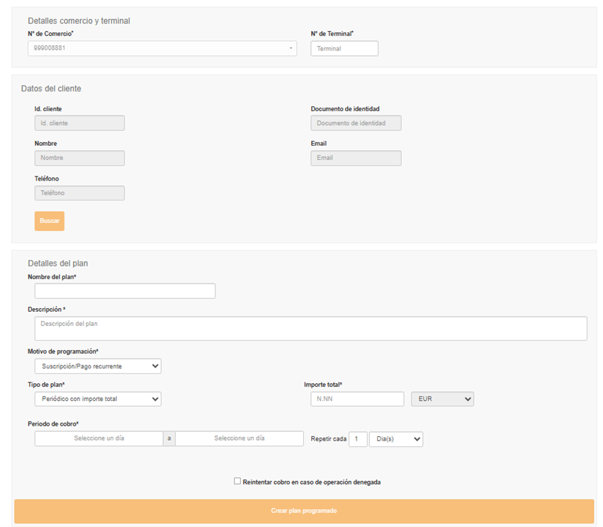 - Detalles del plan: En esta sección se configuran los detalles del plan de pagos que se aplicará al cliente, ya sea una suscripción o un pago aplazado. Podrás configurar que se reintente en caso de operación denegada y calcular cuotas si se trata de un pago aplazado.
